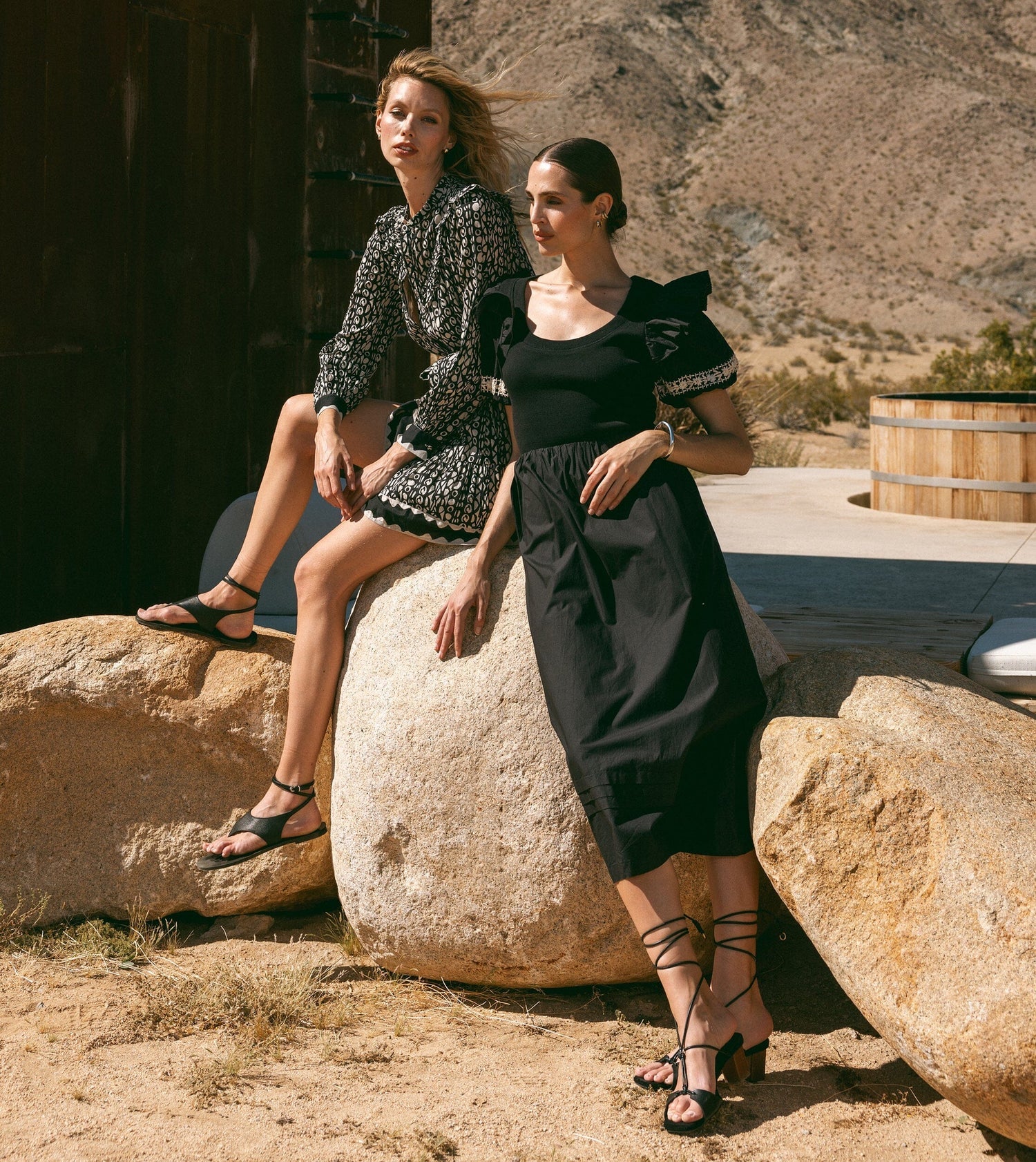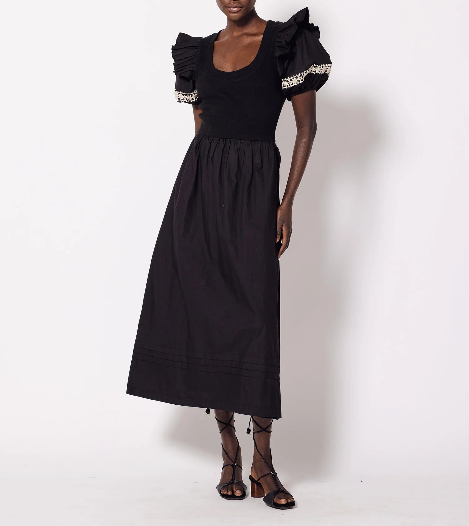 The Selma Midi Dress features a scoop neck, ribbed bodice, puff sleeves with elasticized openings, and intricate hand embroidery. The dress is completed with ruffle details at the armholes, a poplin skirt featuring pintucks, and convenient side seam pockets.