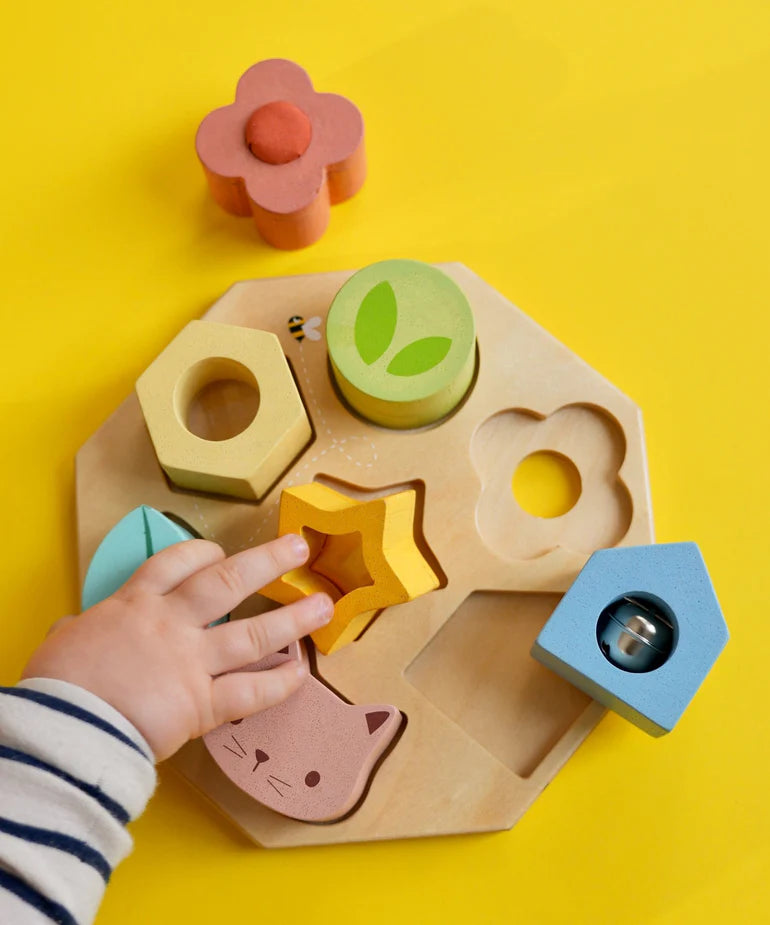 A wooden sensory board featuring 7 removable chunky shape, each providing a different sound or texture. Look through the honeycomb shape, make a clacking sound with the green cylinder, shake the leaf to hear the little beads inside, stroke the fur fabric on the back of the cat, press the flower for sensory joy, shake the bell inside the house, and look through the coloured lens in the star.