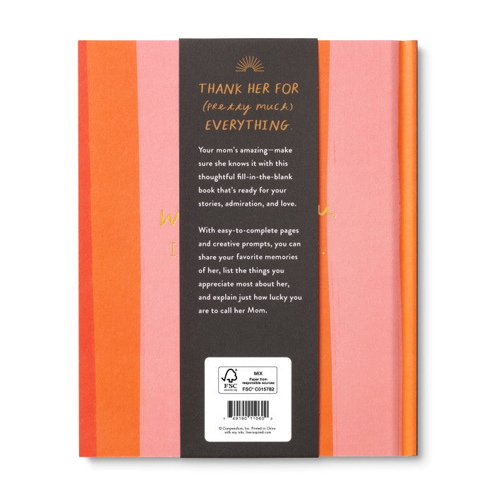 Create a unique gift for Mom with the prompts inside this keepsake gift book. Use the easy-to-complete pages to make Mom smile and fill her heart with love by capturing your favorite memories, listing what you appreciate most about her, and sharing all your love. Each prompt is a chance to express gratitude and let her know just how amazing she is. When you’re done, you’ll have a personalized gift that explains just how lucky you are to call her Mom.