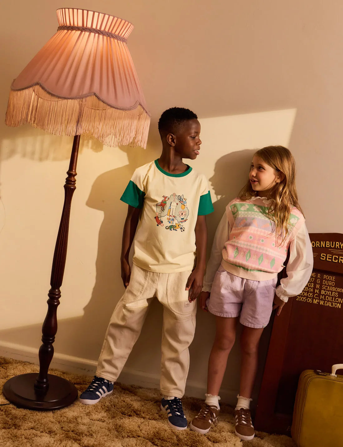 A cozy cotton jersey tee in vanilla and bottle green, featuring our very own 'Jolly Jumpers' family - characters created and drawn by our talented in-house artists.