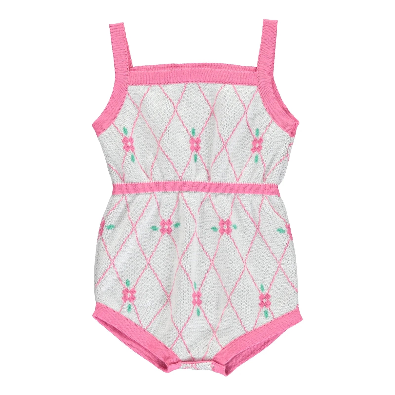 We are in love with this lightweight summer jacquard knitwear featuring fresh florals in pink and green colours for romantic hearts. Tillie overall is effortlessly charming and comfortable- crafted from softest organic cotton. Featuring sleeveless silhouette with gently elasticated waistline and snaps between legs for easy change.