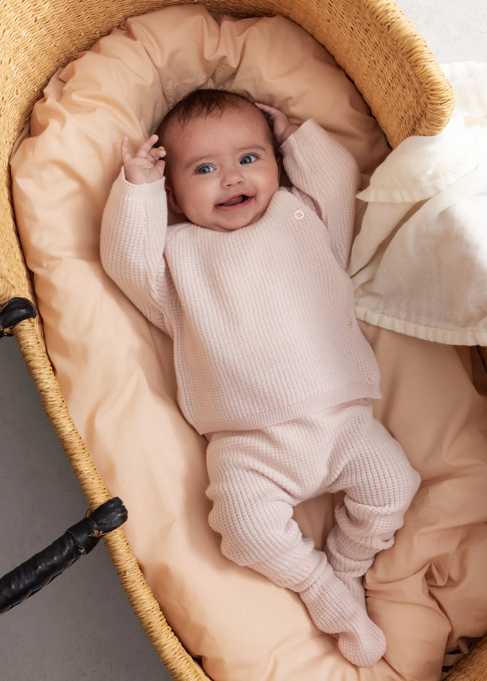Knitted sweater in merino wool for the little ones with raglan sleeves and button closure on the left side. Knitted pants in merino wool with feet and elastic at the waist.