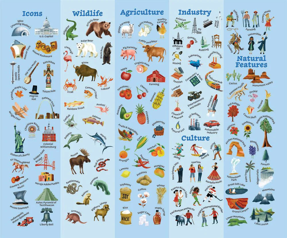 A carefully researched and beautifully designed pictorial map of the U.S.A and its neighbors, brimming with icons by Uta Krugmann offering information about natural and cultural landmarks, industry, agriculture, and wildlife. Includes a color poster identifying these icons. An accessible, educational puzzle offering lessons in geography and beyond.
