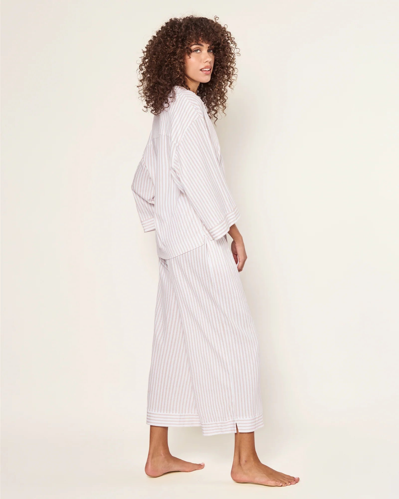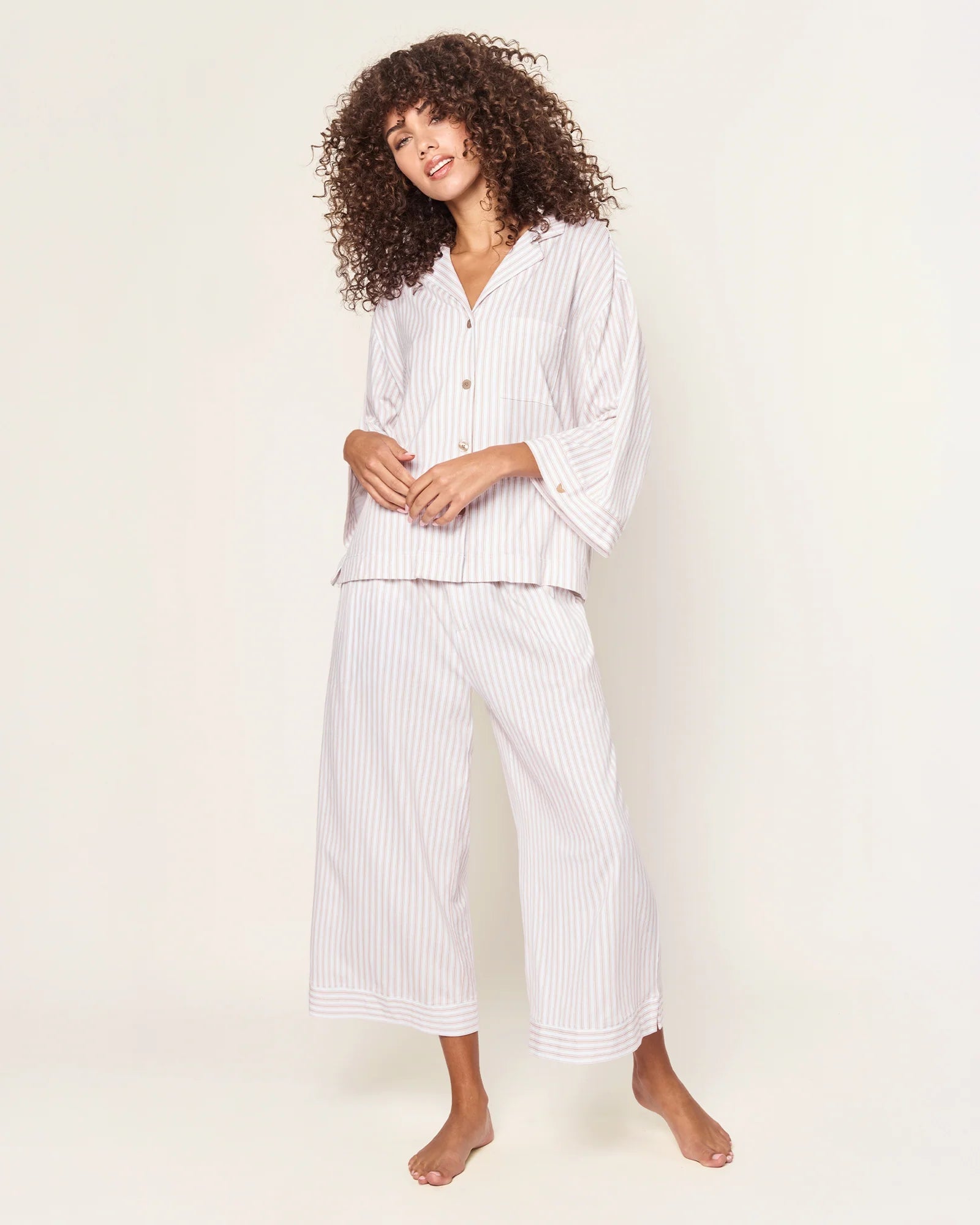 Traditional French ticking is even more classic in this elegant, earthy neutral. The timeless pattern is here to stay, with crisp, clean lines and vintage-inspired detailing. Our wide-leg Pima Cotton pajama set is the apex of comfort and feminine tailoring: a well-considered three-quarter length sleeve, for example, and a more generous pant leg that results in that refined swish-swish sensation at your ankle as you walk down a long hallway.